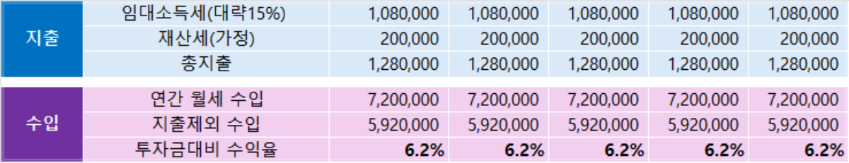 여기에 매년 납부해야하는 임대소득세와 재산세 등을 제외한 실제 수익과 수익률은 아래와 같이 연간 6.2%대로 계산을 할 수 있습니다. 여기에는 공실의 위험성과 중간 중간 임차인 교체에 따른 부동산 중개수수료 추가 등은 고려되지 않았습니다.